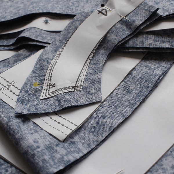 - 3. Epingler et découper le tissu (ici les marges de couture n’étaient pas incluses dans le patron et ont été ajoutées tout autour des pièces papier lors de la découpe du tissu).