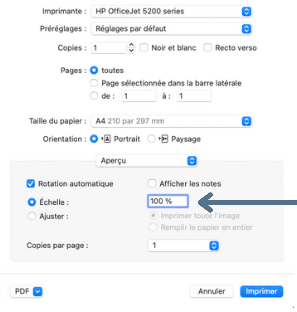 Avant d’imprimer, assure-toi que ton logiciel d’impression est réglé sur une échelle de 100%. 🖨️